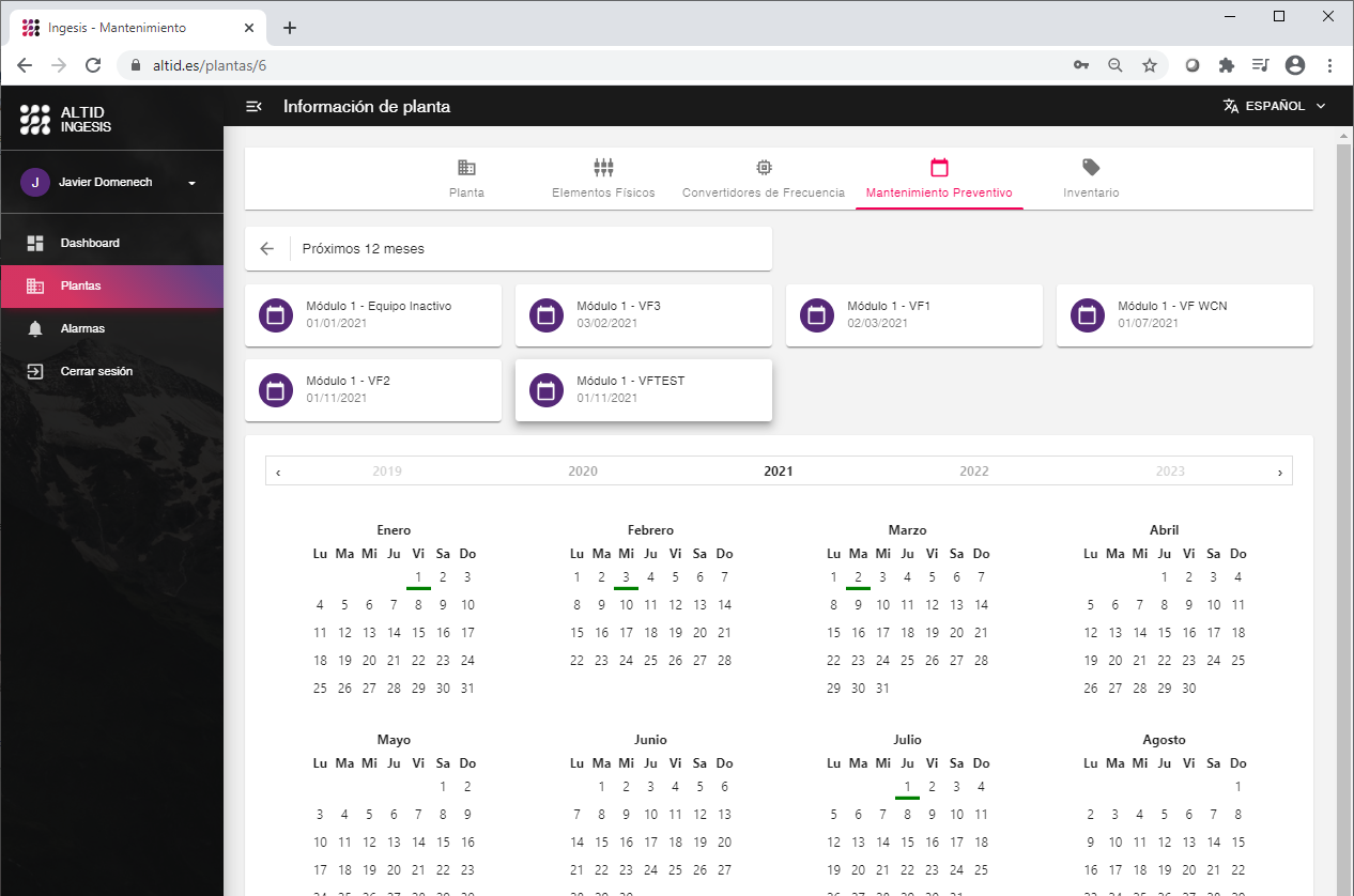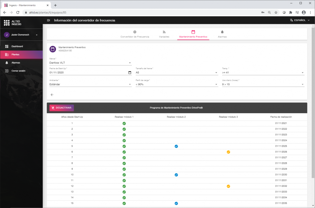 Gracias a la plataforma ALTID podrá solicitar este servicio para los variadores de frecuencia que desee, y podrá gestionar de forma cómoda el calendario de mantenimiento de todos sus variadores de frecuencia, facilitando la tarea de planificación de las paradas necesarias para la realización de las labores de mantenimiento.