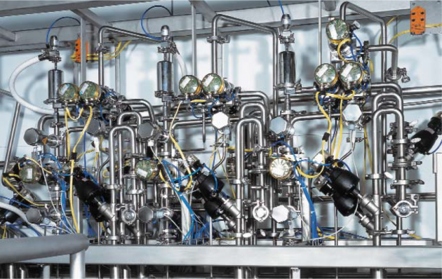Además de su función segura de esta aplicación para colirios, su diseño también garantiza que se puedan limpiar fácilmente externamente (QHD). La conexión de los actuadores neumáticos y la monitorización de la configuración de la válvula se realiza utilizando las cajas de interruptores combinados AS-interface Gemü 4222. Se conectan directamente a los actuadores de válvula y tienen a su disposición el direccionamiento a través de válvulas piloto integradas y la retroalimentación de la posición final al sistema de bus campo. La alimentación de vapor estéril del sistema CIP está equipada con válvulas de globo de asiente angular Gemü 554.