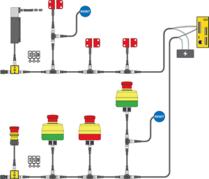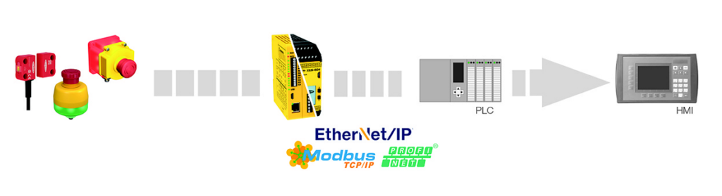 La tecnología que hace posible el diagnósticos en serie está integrada en los dispositivos de seguridad y se comunica mediante los mismos cables, conectores, adaptadores y entradas que conectan los dispositivos al controlar de seguridad.
