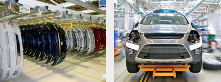 Detección de parachoques y salpicaderos en el proceso de pintura en la fabricación de automóviles. Utilización de tags de alta temperatura IP67 con un soporte específico.