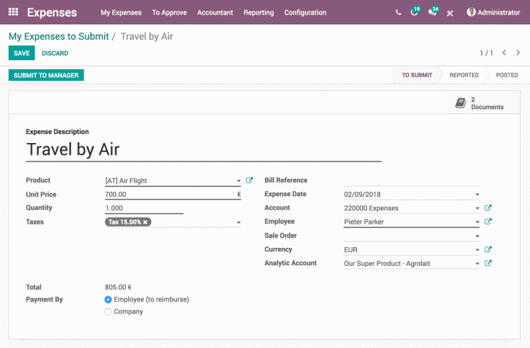Los empleados pueden enviar y justificar gastos con facilidad. Los gerentes pueden revisar todos los gastos y aprobar o rechazar solicitudes individuales si los necesitan. Una vez aprobados, los gastos se actualizan de inmediato con el módulo de Contabilidad de Odoo.