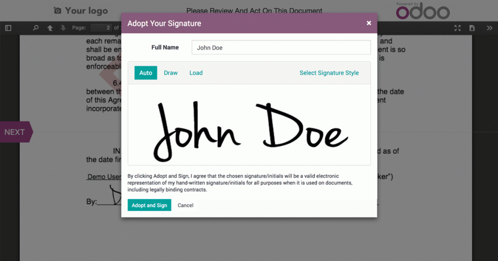 Integridad de documentos: Odoo mantiene el documento autorizado bajo control en todo momento. Cualquier actividad en el documento (lectura, firma, etc.) se encripta para garantizar la inalterabilidad del documento. Un reporte de registro de auditoría está disponible para todas las partes en cualquier momento.