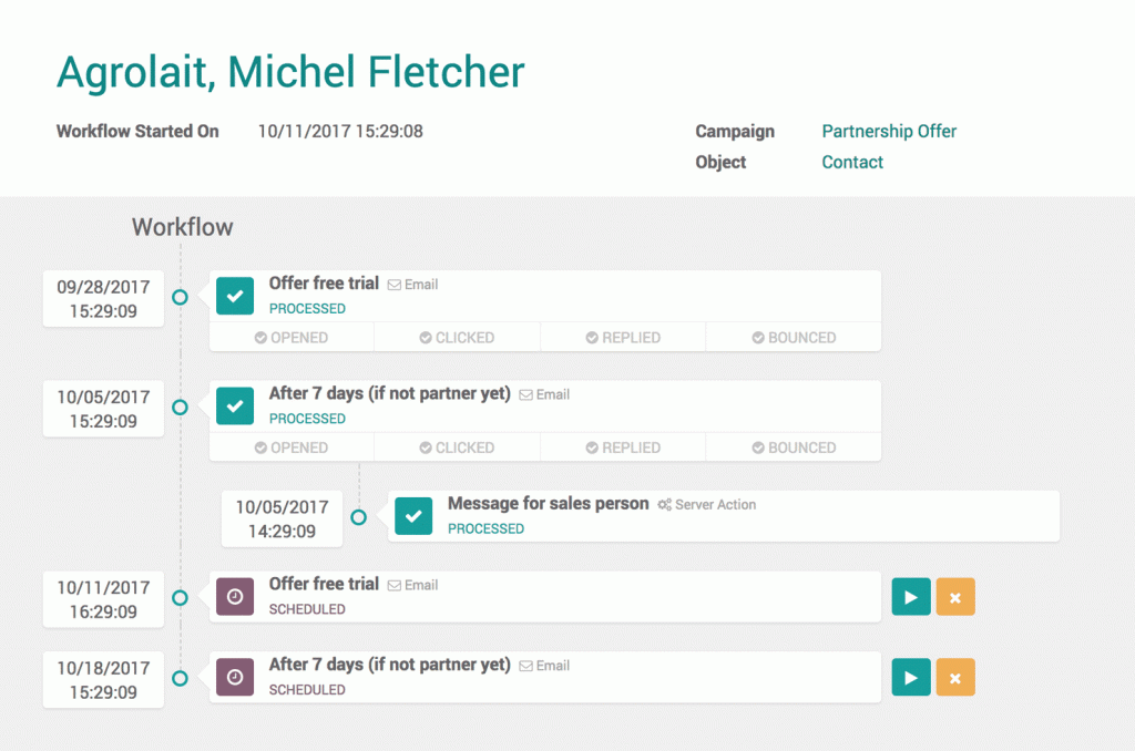 Crea trayectos integrales de los clientes y utiliza flujos de trabajo para automatizar tareas (avanzar un lead en tu flujo de ventas, asignar clientes potenciales comprometidos a tu equipo de ventas, actualizar un registro, etc.)