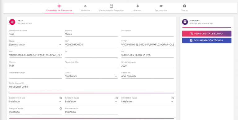 Mejora de la funcionalidad OCR de interpretación de la placa de características del variador de frecuencia para identificar y caracterizar equipos Vacon. Se ha adaptado el formulario de registro para incluir los campos específicos de los variadores de frecuencia Vacon.